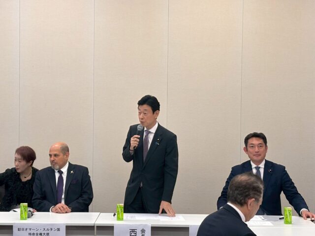 友好議連の西村康稔会長を補佐する役目として、急遽、司会を務めさせて頂きました。モハメッド・サイード・アル・ブサイディ大使閣下からは日本を思う気持ちが沢山伝わりました。今、世界のニュースになっているホルムズ海峡はイランだけでなく、オマーンの海域もあります。それだけに、オマーンは極めて重要な国となります。天然資源も採れるので今後より綿密な連携が必要です。